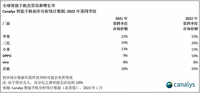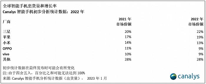尽管受到了需求萎缩和供应链问题的影响,苹果仍获得了有史以来最高的季度市场份额,达到25%。三星虽然在四季度以20%的市场份额屈居第二,但其仍是全年出货量最大的厂商,全年市场份额达到22%,比苹果高出3个百分点。