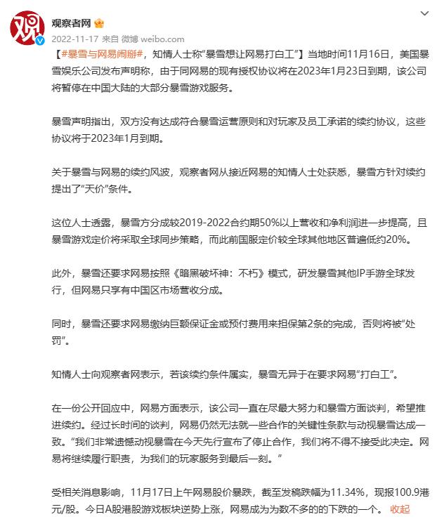 2022年11月17日上午,暴雪突然单方面宣布与网易的授权协议即将到期,双方未能达成续约。恰逢此时正好是网易方发布财报的关键节点,网易暴雪合作终止的消息一度让网易的股价暴跌了11.34%左右。
