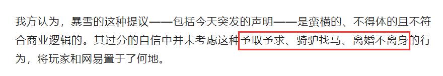 另外一边,网易官方在当天晚上对该事进行了回应,称暴雪希望延期6个月的提议以及1.17日发布的声明都是蛮横的、不得体且不符合商业逻辑的,网易更是把暴雪的这种行为喻为“予取予求、骑驴找马、离婚不离身”。