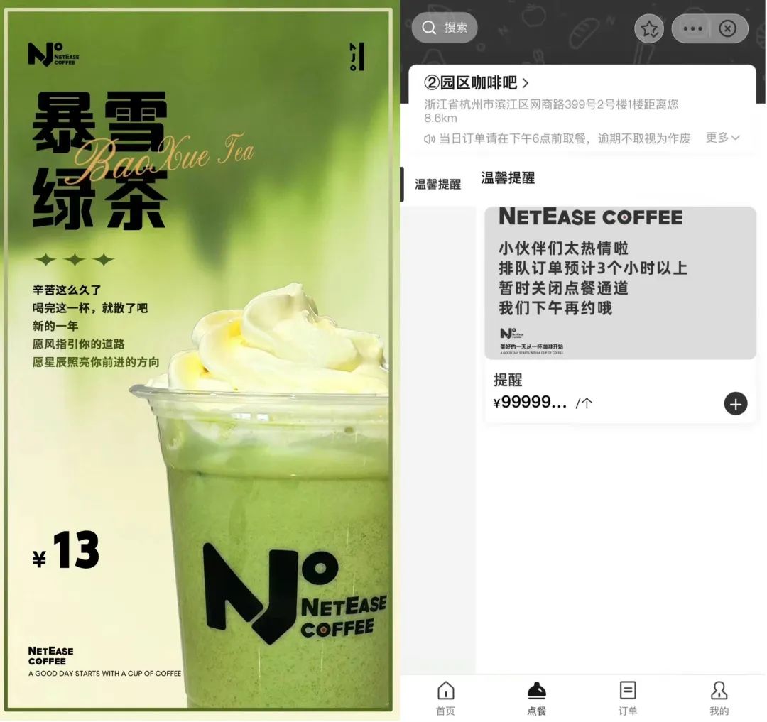 对于暴雪此次行为,网易除了在发布公告回应外,还在别的地方给予了回(zheng)击(huo)。据悉,网易咖啡厅连夜推出一款名为“暴雪绿茶”的饮品,并且将售价标注为颇有深意的13元。果不其然,该饮品在开放点单后的一个小时就被热情的网易员工直接“买爆”,导致咖啡吧过载不得不暂时关闭点餐通道。