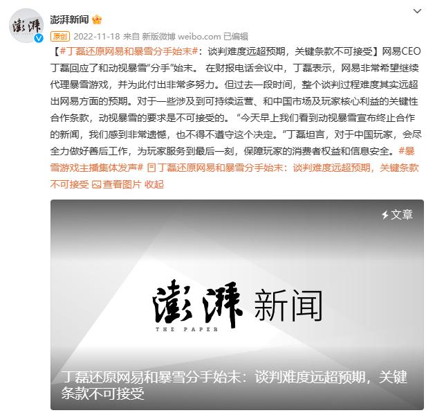 2022年11月18日,经澎湃新闻整理的网易Q3财报电话会议中,丁磊表示:网易非常希望继续代理暴雪游戏,并为此付出非常多努力。但过去一段时间,整个谈判过程难度其实远超出网易方面的预期。对于一些涉及到可持续运营、和中国市场及玩家核心利益的关键性合作条款,动视暴雪的要求是不可接受的。