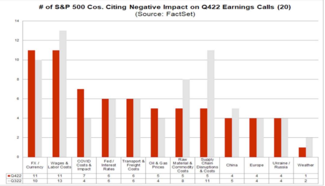 截止到目前,共有20家企业公布了第四季度业绩。鉴于目前对第四季度收益下降的预期以及对2023年经济衰退的担忧,这20家公司分别讨论了对利润、收入或利润率有负面影响的具体因素。