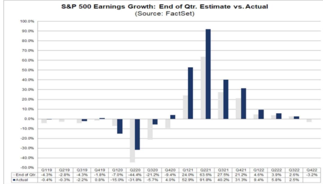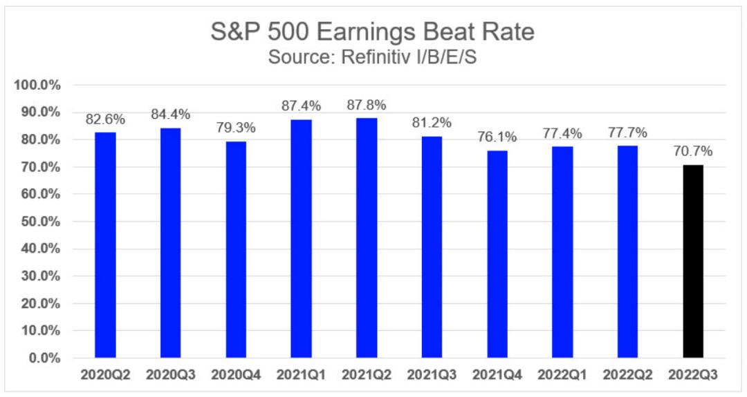 在2022年Q3,70%的公司盈利超预期,低于5年来的平均值77%,也低于10年来的平均值73%,也正是因为2022年Q3是过去9个季度以来“超预期”情况最不理想的季度,很多公司早就已经打了预防针,调低指引、提前就把市场预期降低,因此大部分的分析师都会根据最新信息对预测值进行调整,市场共识也会因此得到下降。