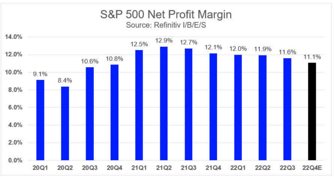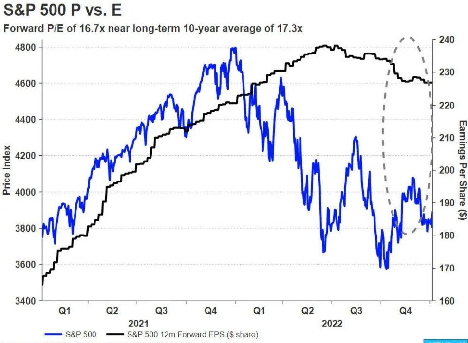 市场现在的担心是市场正处在盈利与亏损的边缘,美联储异常紧缩导致的需求疲软以及持续的成本压力,促使许多行业的管理团队提供了悲观的指引。但是这些并不是新的担忧,自Q3财报季开始,这种种担忧就一直存在,与这种恐惧有关的观点是,目前的盈利预期仍然很高,需要大幅削减,以与不断发展的经济现实保持同步。