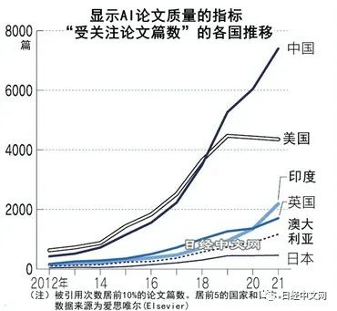 日本经济新闻(中文版:日经中文网)在荷兰学术信息大型企业爱思唯尔(Elsevier)的协助下进行了分析。利用约800个AI相关的关键词等,以2012~2021年的学术论文和学会论文为对象,分析了各国和企业的“研究能力”。目前的AI热潮以“深度学习”技术的创新为契机,于2012年前后兴起,涵盖了图像识别和文章生成等广泛领域。