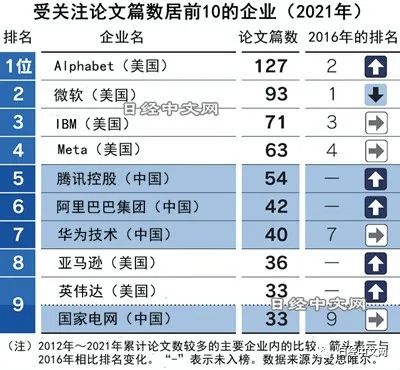 另一方面,从企业来看,美国仍占优势。在数量方面,微软、旗下拥有谷歌的Alphabet和IBM是最近10年的3强。在质量方面,在2021年受关注论文篇数的前10之中,排在首位的 Alphabet等美国企业占6家。