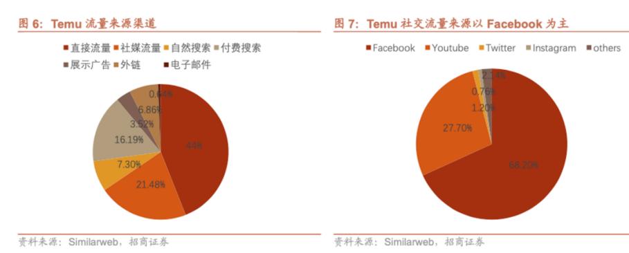 高投入确实给Temu带来了客源。Similarweb数据显示,在Temu的流量来源中,社交媒体流量占21.5%,其中又以Facebook和Youtube最为重要。