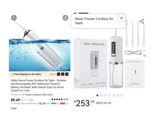 诚然,占据低价优势的Temu给亚马逊带来了一定的冲击。以某款冲牙器做对比,Temu的价格换算成人民币约为66元,而亚马逊外形相似的产品,却要253元,比Temu整整高出三倍。