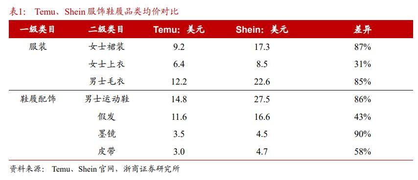 Temu、SHEIN 服饰鞋履品类均价对比,来源:浙商证券研究所