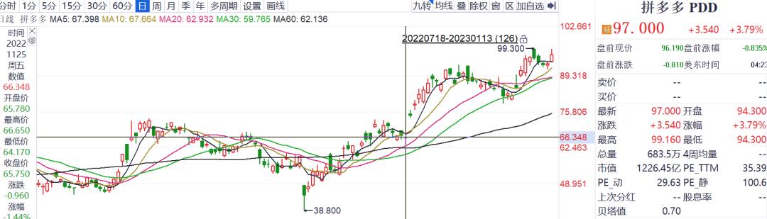 而2023年1月17日,拼多多收盘价为97美元,较2022年3月份的年内最低价23.2美元,反弹近300%。