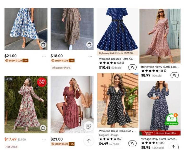 两家平台长裙比较,来源:图左为SHEIN截图,图右为Temu截图