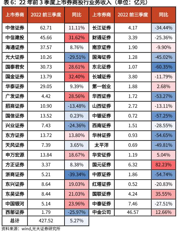 不过看看前三季度的全盘业绩,我们就能发现券商投行业务的马太效应还是比较严重的,许多券商都是负增长,而且有投行人表示,2022的投行业务没有那么喜人,过会的项目比较少,看上去头部大券商投行业务收入多了,那是因为发行的金额增加了。