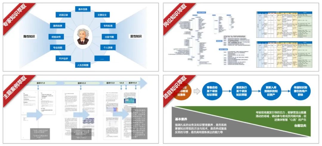 再例如模块九的知识萃取及经验复盘,可以从人和事、个体和组织两个维度的角度,分成4个领域:专家知识萃取、岗位知识萃取、主题案例萃取、项目知识萃取。