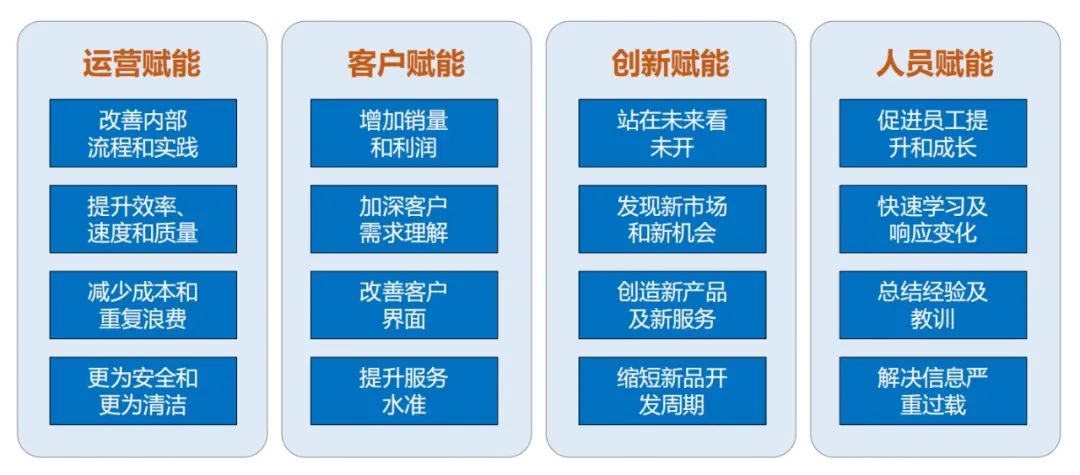 运营赋能:比如改善内部的流程和实践,提升效率速度和质量,减少成本和重复浪费等。