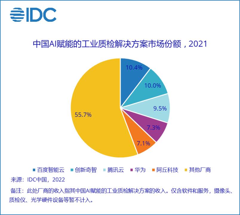 IDC的报告显示:AI质检市场份额上,2021年前五大主要厂商的市场份额达到了44.3%,主要集中在百度智能云、创新奇智、腾讯云、华为、阿丘科技等厂商。