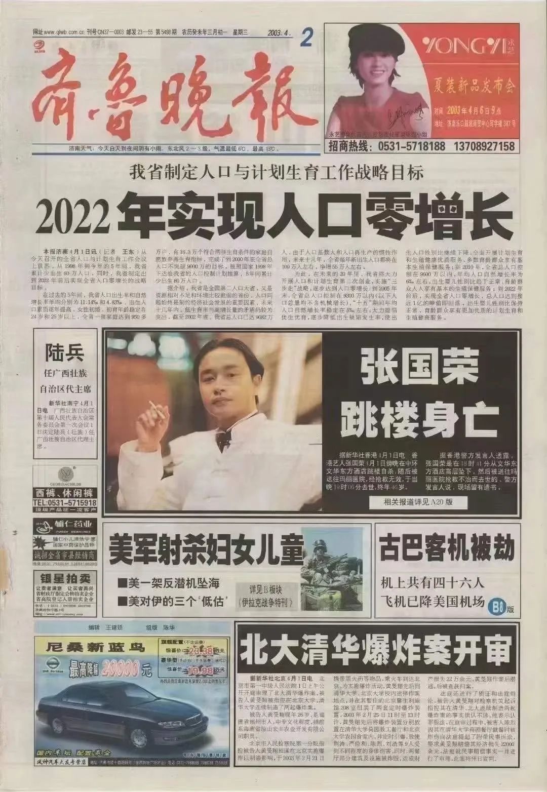 网友找到一张齐鲁晚报的图片,根据上面张国荣跳楼身亡的新闻,很明确的告诉我们这是2003年4月1日的报纸,当天的头版为2022年实现人口零增长。现在看来,20年前的预测相当准确,当时人口零增长还作为我国努力的目标,但现在来看,这已经成了一个巨大的隐患。