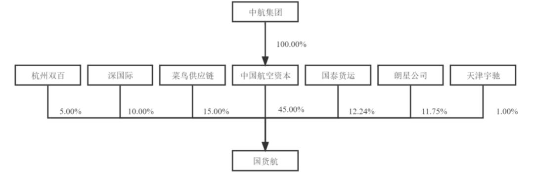 国货航前身为2003年成立的国货航有限,由国航公司、中信泰富、首都机场集团共同投资建立。2022年6月,国货航有限整体变更为股份有限公司。变更完成后,国货航股东为中国航空资本、国泰货运、朗星公司、菜鸟供应链、深国际、杭州双百及天津宇驰,其中中国航空资本持股45%,为公司控股股东。中航集团因持有中国航空资本 100%股权,系公司的实际控制人。天津宇驰为发行人员工持股平台。