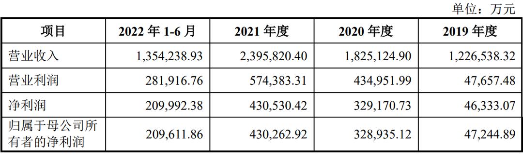 据招股书,2019年、2020年、2021年和2022年1至6月,发行人分别实现营业收入122.65 亿元、182.51亿元、239.58亿元和135.42亿元,分别实现净利润4.63亿元、32.92亿元、43.05亿元和21.00亿元,总体呈现较快增长趋势。