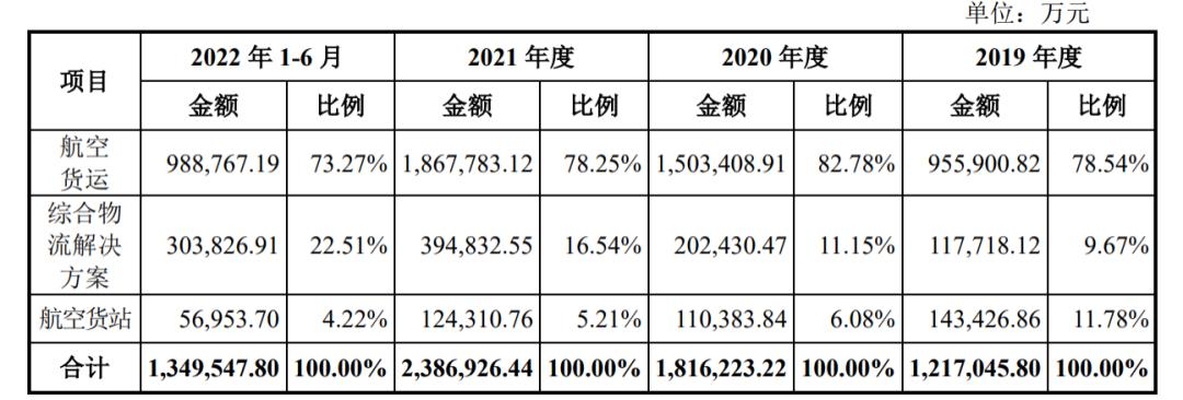 报告期内,公司主营业务收入主要来自于航空货运、综合物流解决方案以及航空货站。其中,航空货运业务收入的占比最大,报告期内占比分别为78.54%、82.78%、78.25%以及73.27%,其次为综合物流解决方案,占比分别为9.67%、11.15%、16.54%以及22.51%,航空货站运营收入占比相对较小,且呈下降趋势。