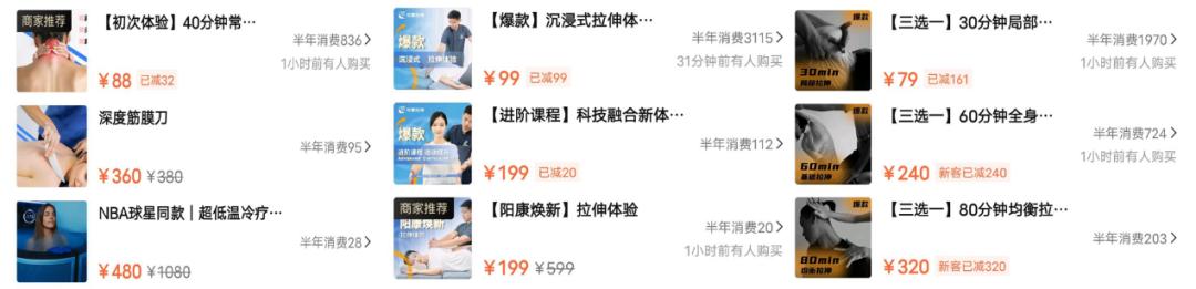 大众点评上主流拉伸康复馆的团购体验产品销量较为可观