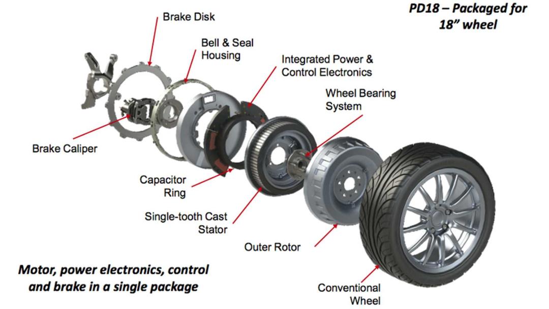 轮毂电机很好理解,就是放在轮毂里的电机。电机转,车轮就跟着转,开头说到的现代 IONIQ 用的就是这个方案。