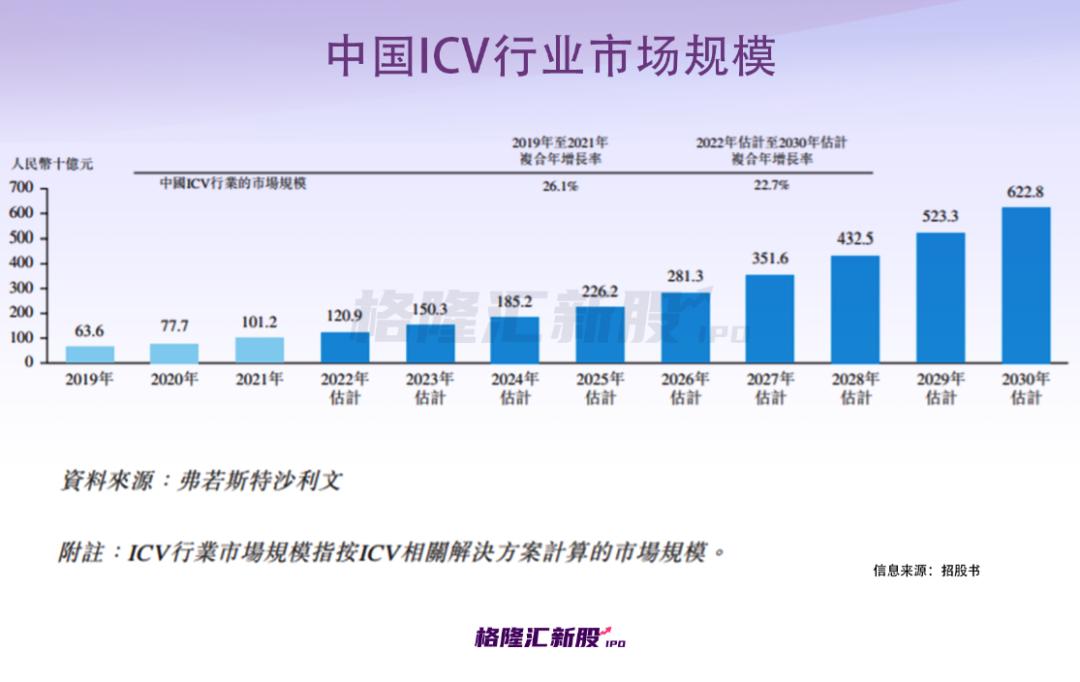 随着智能驾驶技术的不断发展,以及消费者对智能汽车接受度的提高,我国ICV测试、验证和评价解决方案行业的市场规模也稳步增长。据弗若斯特沙利文资料,按收益计算,2021年中国ICV行业市场规模已增长至约1012亿元,从2022年起的复合年增长率约为22.7%,预计2030年将增至约6228亿元。