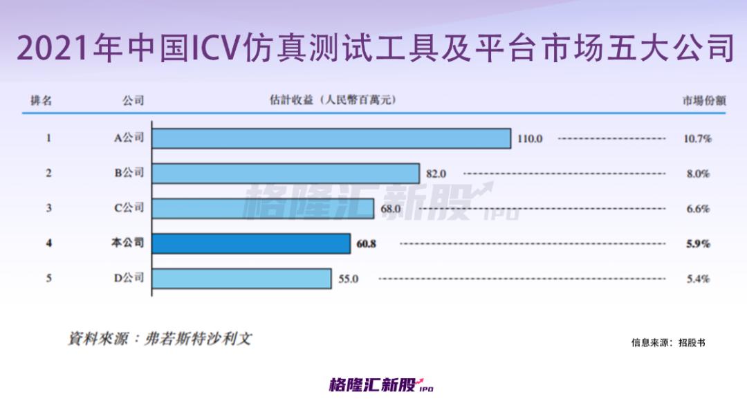 据弗若斯特沙利文资料,2021年,中国ICV仿真测试工具及平台的市场规模达到约10亿元,按收入来算,前五大市场参与者占据了整个市场约36.7%的份额。其中,赛目科技以约5.9%的市场份额位列第四,也是前五名中唯一的中国公司。