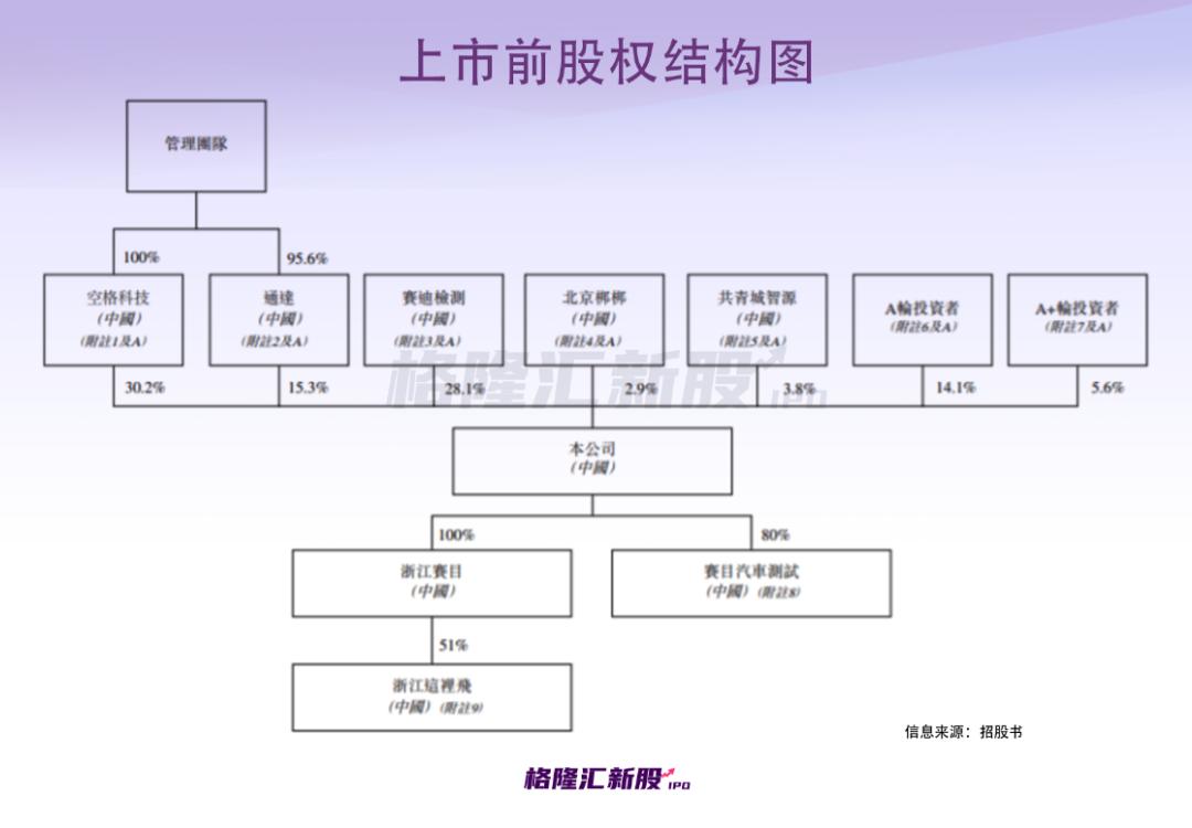 据招股书,本次发行前,空格科技和通达在赛目科技已发行股本总额中合共拥有约45.5%的权益,而胡大林、马蕾、何丰分别持有空格科技约64.1%、25.6%及10.3%的股份,上述三人及公司17名员工分别持有员工激励平台通达50%、2.1%、43.5%、4.4%的权益。空格科技与通达签订了一致行动人士协议,因此,空格科技、通达、胡大林、马蕾、何丰共同成为公司控股股东。