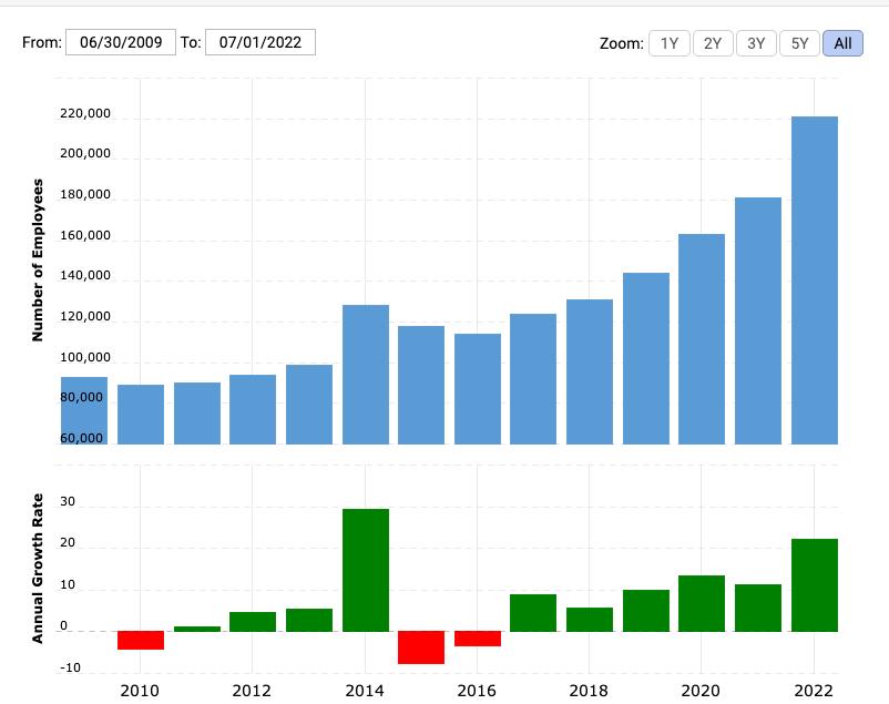 亚马逊员工总数从2019年底的79.8万人急剧增长到2021年的160万人,整整增加了80万人。微软员工总数从2019年底的14.4万人急剧增长到2022年的22.1万人,增长了超过三分之一。即便是此次全球裁员1万人,微软员工总数依然远远高于2022年初的18.1万人。
