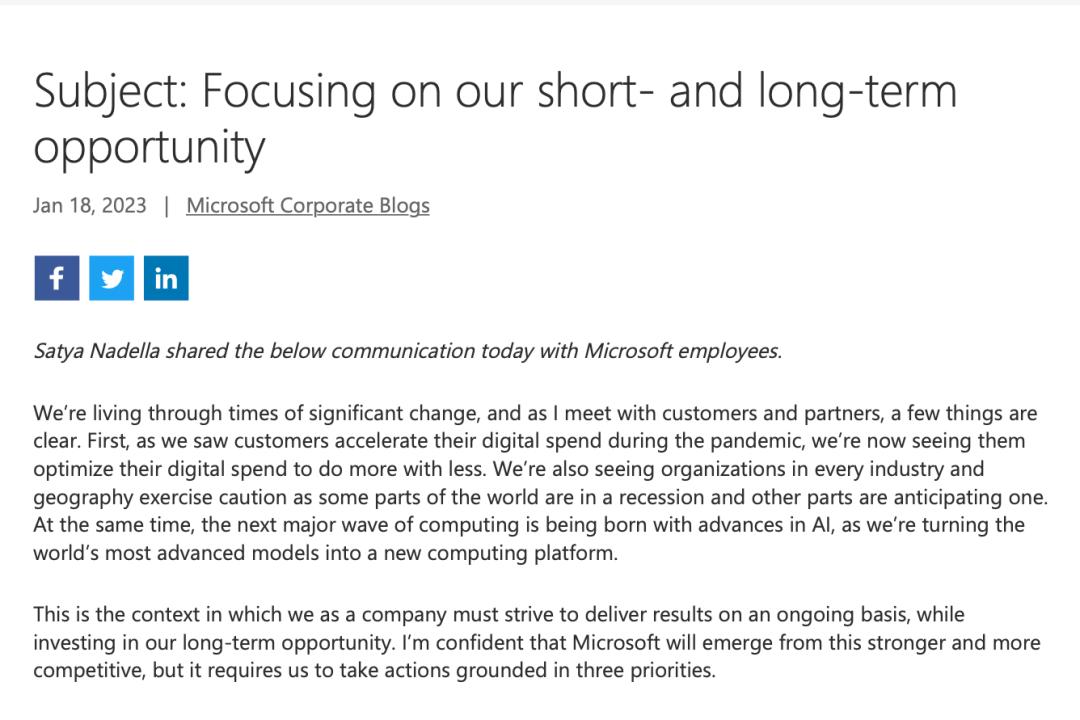 就在宣布裁员消息的同一天,纳德拉在达沃斯接受采访时表示,科技行业进行收缩是因为消费者需求出现下滑,“我们正在经历消费需求进行某种程度回归常态的阶段”,微软因此需要提高生产力来推动增长。