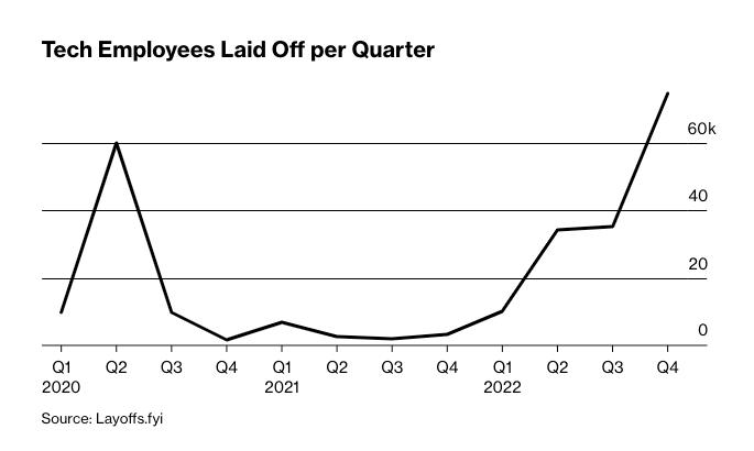 咨询公司CGC(Challenger, Gray & Christmas)的统计显示,2022年科技行业在美国裁员总数为97171人,是本世纪初网络股泡沫之后裁员最多的一年。而Crunchbase网站的裁员统计也给出了相近的数字(10.7万人)。
