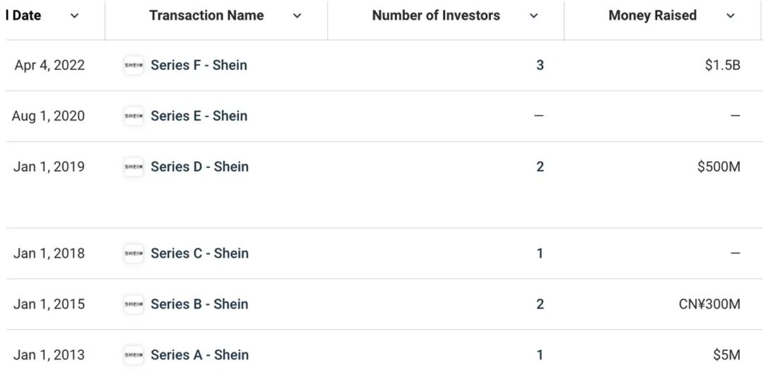 2018年7月,Shein获得红杉资本、顺为资本等参与的具体金额不明的数亿美元C轮投资,估值从2.5亿美元翻了十倍至25亿美元;2019年12月,Shein再次获得获来自Tiger Global Management和红杉资本超5亿美元D轮投资,此轮估值超50亿美元;2020年8月,获得投资方不明的数亿美元E轮融资,而此次估值来到了150亿美元;2022年4月完成由General Atlantic、 Tiger Global Management、红杉中国、顺为资本等参与的10亿美元融资估值达到1000亿美元。
