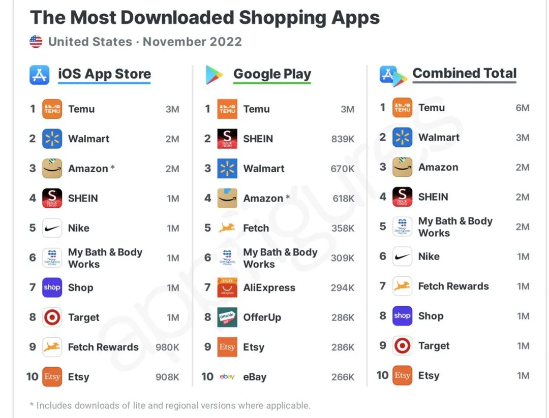 Temu在去年9月首次登陆美国市场后,仅用了一个月的时间就在10月登顶美国谷歌和苹果应用程序商店的榜首,超越了此前一直反复霸榜的Shein,领先于亚马逊、沃尔玛等。从10月开始,Temu的增长势头一直不减,稳居在美国商店的下载量前5名,而Shein的排名却开始出现下降。