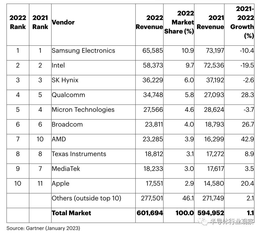 2022年是半导体行业历经沧桑的一年,半导体行业见证了世界大变化,在种种不确定和突发性因素的交叉下,整个半导体产业负重前行。复盘整个半导体的2022年,新技术和新产品仍旧不断推出,大大小小的行业并购案依然在进行。每家半导体厂商都在与当下多种不可控因素抗衡,Gartner近日发布了2022年全球前十的半导体供应商排名情况,虽然没有巨大的厂商替换变化,但是一叶知秋,这些冰冷的数字却可以最直观的反映一个企业乃至整个行业最真实的状况。