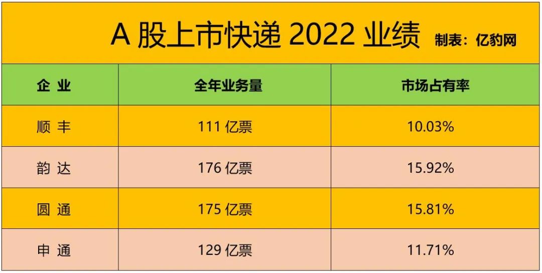 综合2022年1-12月数据,顺丰全年业务量达111亿票,韵达全年业务量约176亿票,圆通全年为175亿票,申通为129亿票。