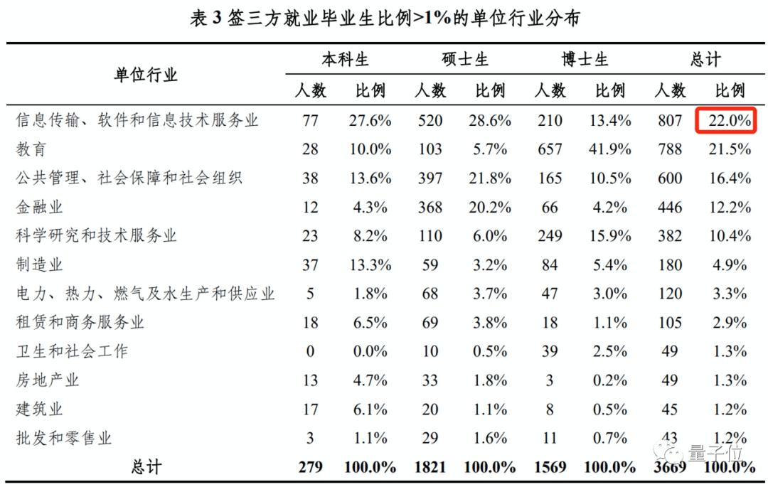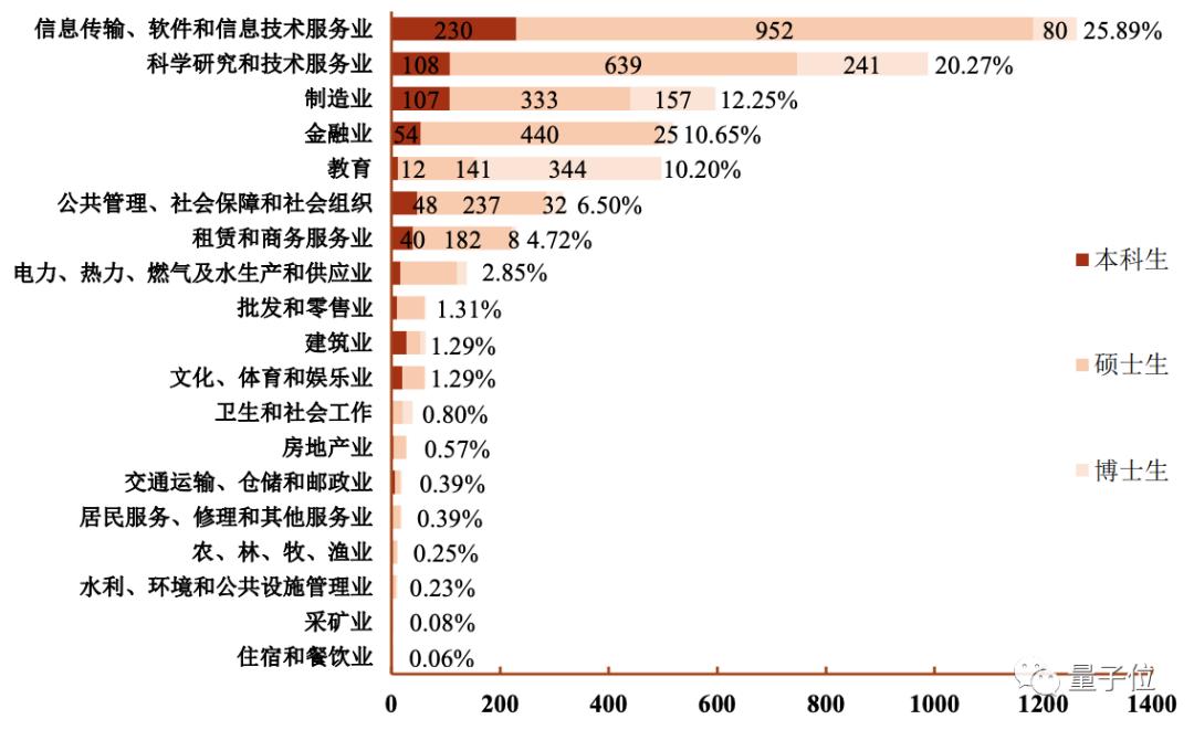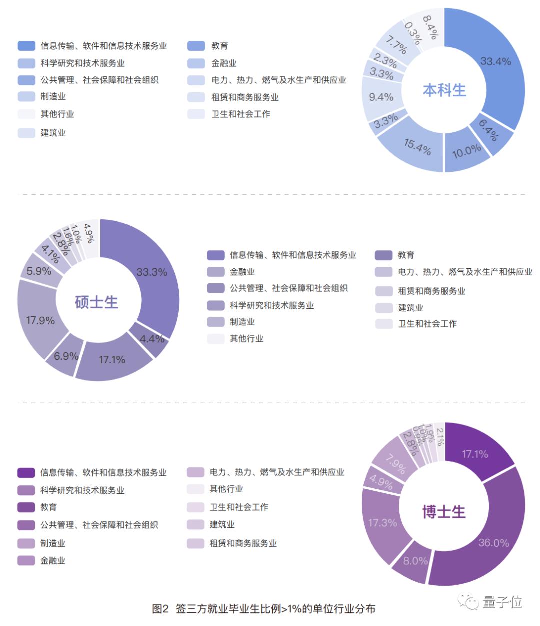 在本硕博就业毕业生中,进入“信息传输、软件和信息技术服务业”的比例分别是:33.4%、33.3%和36.0%,均超过三分之一。