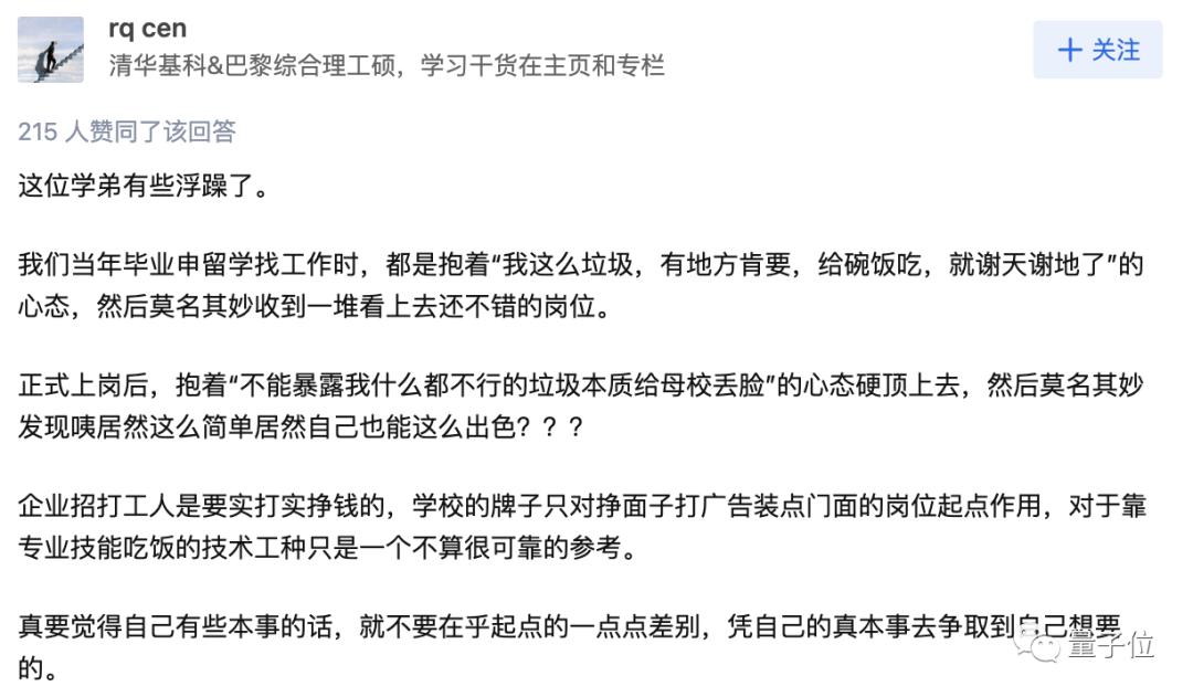 最后,他还对这位“有些浮躁”的学弟建议:真要觉得自己有本事,就不要在乎起点的一点点差别。