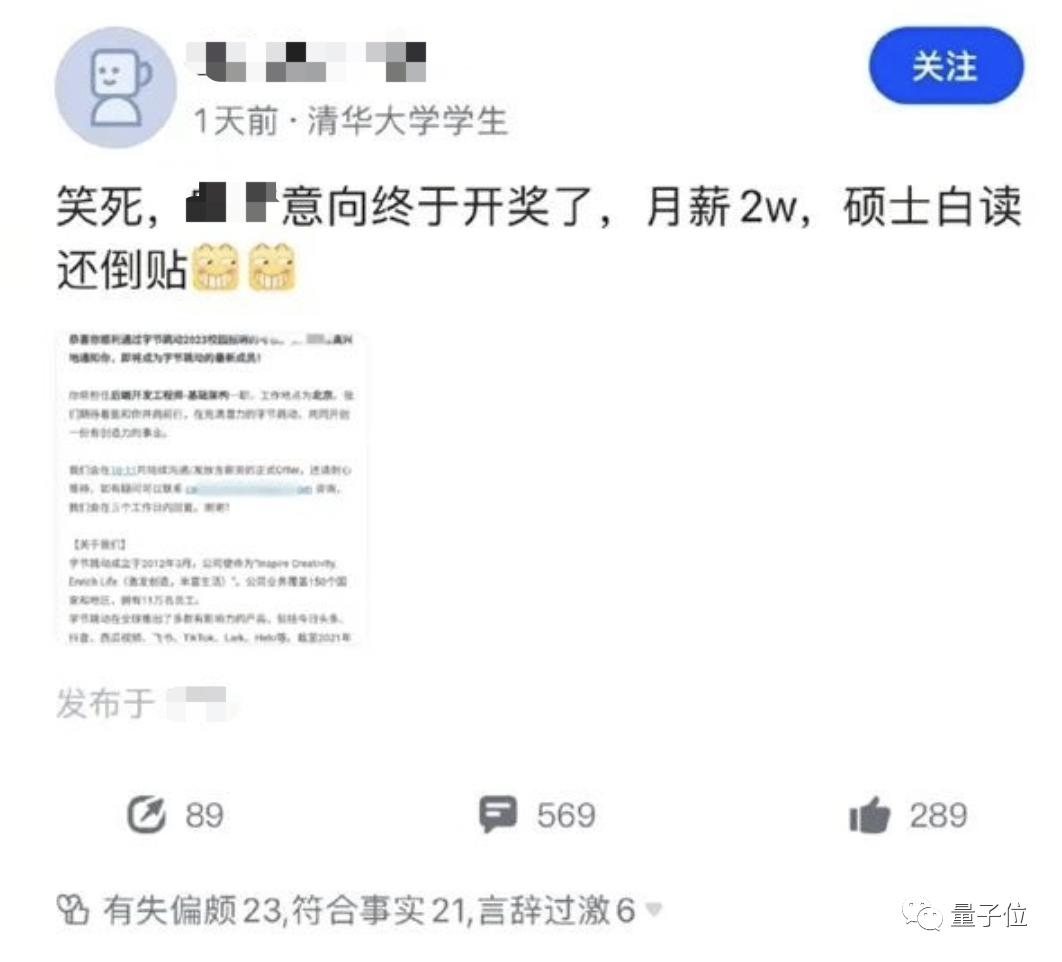 事件的起因是源于脉脉上的一篇吐槽贴。一位清华大学学生收到月薪两万的大厂意向书,或许不符预期,于是称自己“硕士白读还倒贴”。