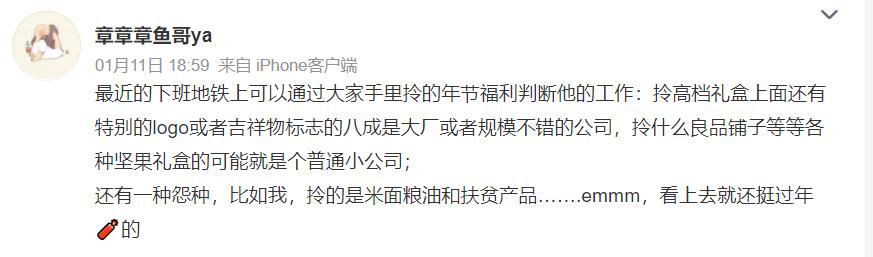 甚至有的公司“狸猫换太子”,将年终奖兑换成物理体积较大的物品发放给员工,拎着定制大logo礼盒的趾高气昂,拎着不知名“扶贫产品”(大米、油)的只能负重前行。