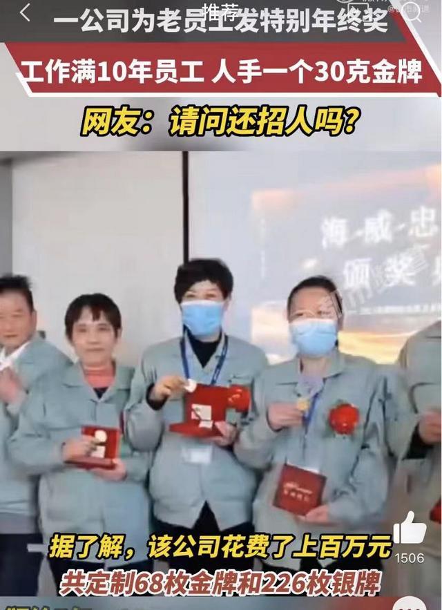 近日一家公司老板为“发票子还是发金子”而犯愁,后来老板选择花上百万给工龄满10年的所有员工发放30g金牌,满5年的员工发放银牌,除了基本员工外,保洁阿姨和安保大叔都在获奖名单内,羡煞旁人,一度顶上微博热搜。
