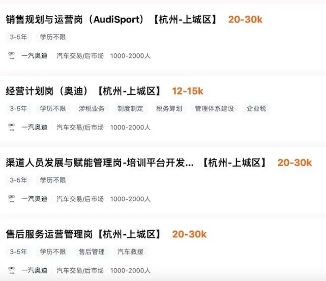 时代财经了解到,一汽奥迪的公关团队不少人员任职于杭州的一汽奥迪销售有限公司。据某招聘网站显示,一汽奥迪当前在杭州市公开招聘多个岗位,涉及经营计划岗、营销策略岗等,月薪在1.2万元-4万元之间。