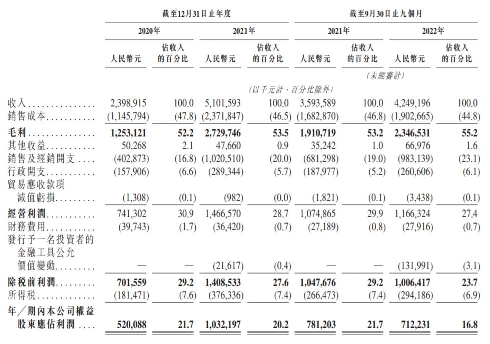 从盈利能力来看,2020年、2021年及2022年前9个月,珍酒李渡的毛利率分别为52.2.%、53.5%以及55.2%;当期公司权益股东应占利润分别为5.20亿元、10.32亿元和7.12亿元。