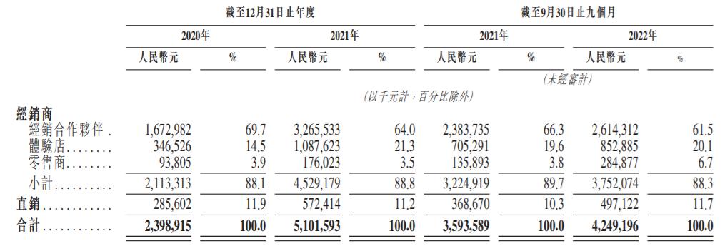 珍酒李渡的主要销售渠道是经销与体验店,经销收入占比从2020年的69.7%降到2022年9月30日止的9个月的61.5%;体验店的收入占比则从2020年提升5.6个百分点至20.1%;零售商则贡献了6.7%的收入。