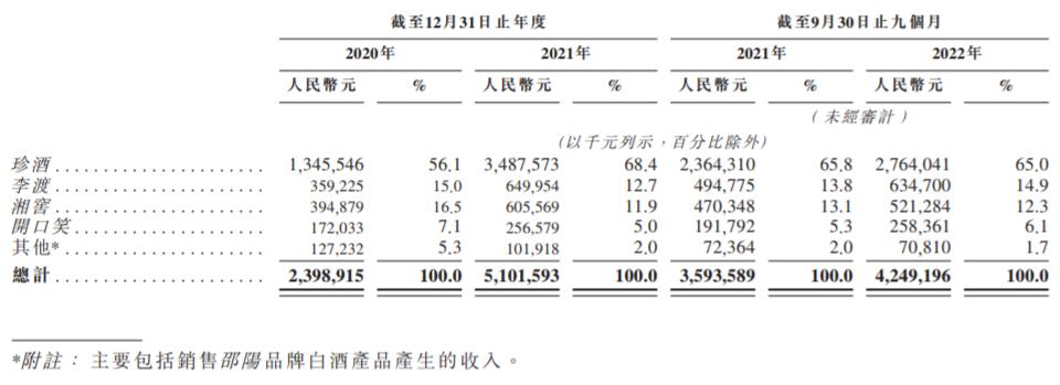 根据弗若斯特沙利文的资料,2021年珍酒李渡是营收第四大的民营白酒公司,在拥有三种或以上香型的白酒公司中排名第三。招股书显示,珍酒李渡2020年、2021年及2022年前9个月的总收入分别约为23.99亿元、51.02亿元以及42.49亿元。