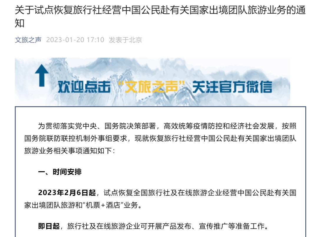 根据文旅部旗下的文旅之声下午17点消息,2023年2月6日起,试点恢复全国旅行社及在线旅游企业经营中国公民赴有关国家出境团队旅游和“机票+酒店”业务。