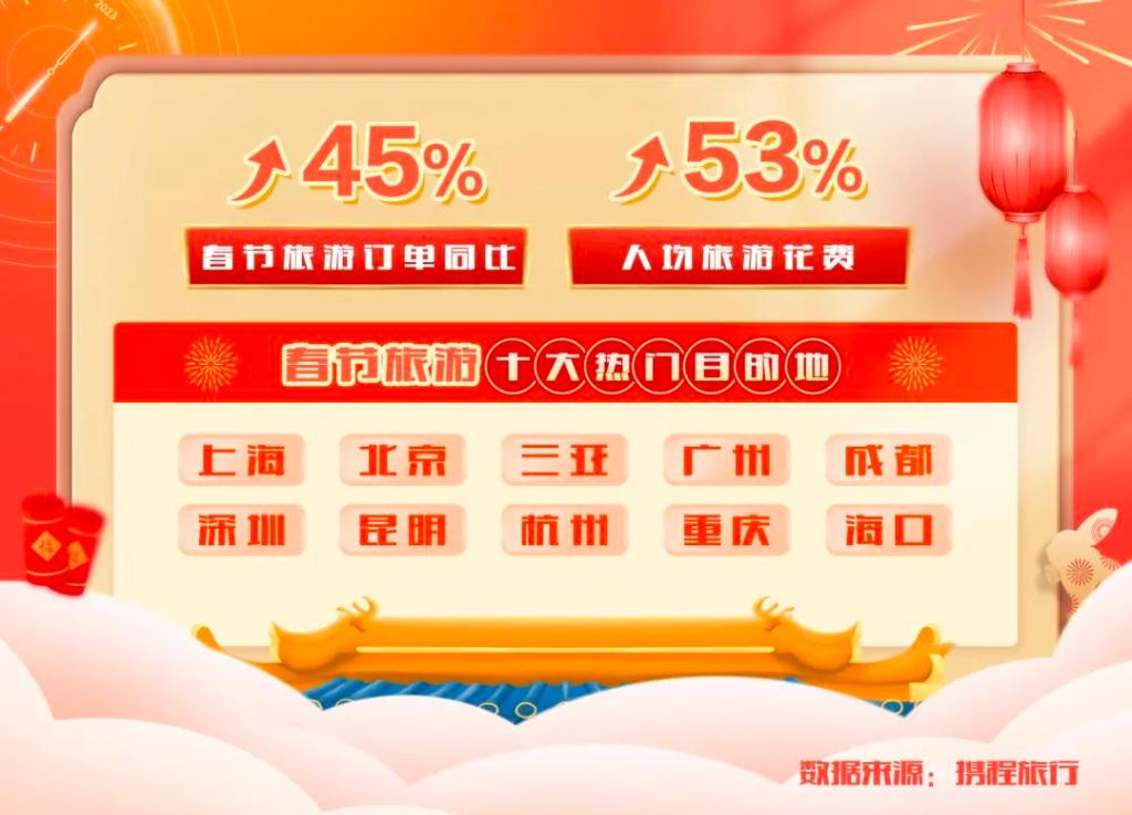 而从携程平台给出的数据看,春节假期国内包团定制游、团队游、主题游均受到游客欢迎。截至2023年1月10日,包团定制游预订量同比去年春节假期预订量增长90%,团队游预订量同比去年春节假期预订量增长354%,主题游预订量同比去年春节假期预订量增长151%。