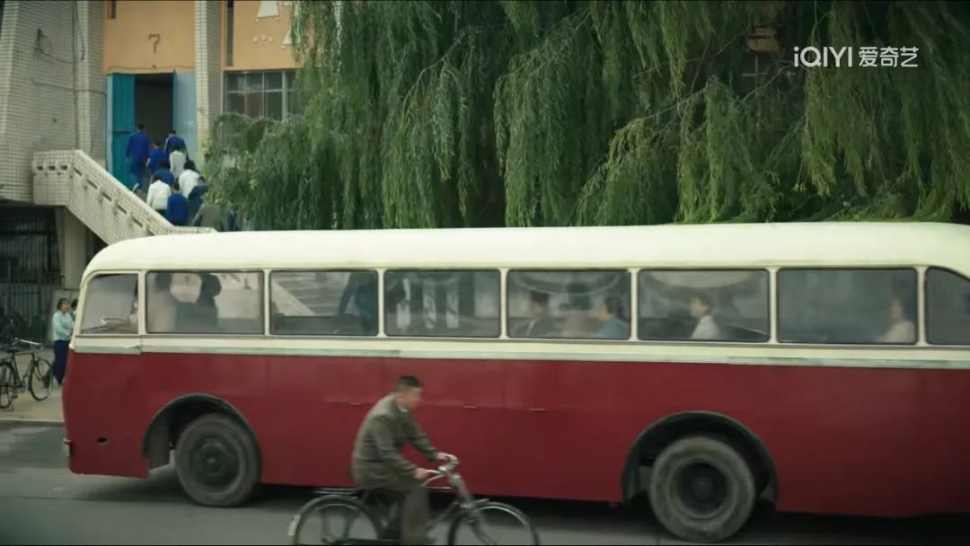 我们看第一集的第一场戏,一个遍布柳树和自行车的街道外景,男性穿深蓝色外套,女性穿浅色上衣,都是裤子。镜头缓慢右转,一辆极具年代感的红白公交车驶入画面,镜头在这里剪辑,焦点从上车的行人聚到女人身上,看书,碎花长裙,背影,一个可能出现在这个环境里,却与这个环境格格不入的人物。随后我们看到正脸。