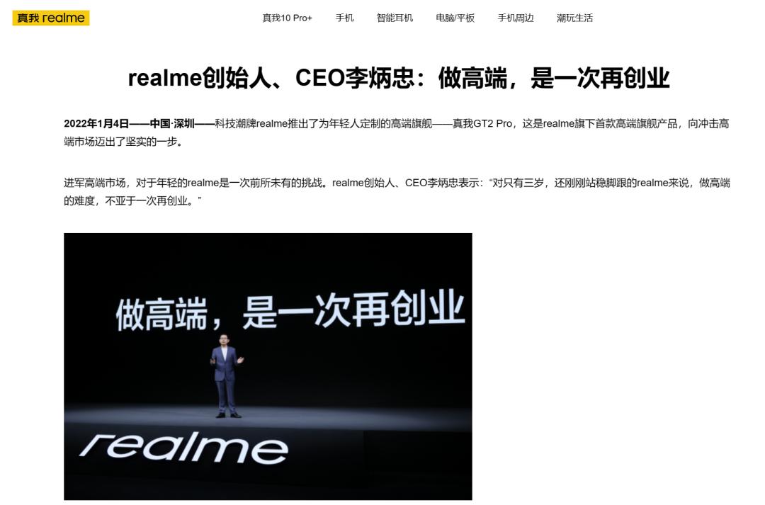 2022 年年初,realme 发布了首款高端旗舰 GT2 Pro,起售价 3699 元。随后的 官方新闻稿 指出,GT2 Pro 是 realme 旗下首款高端旗舰产品,向冲击高端市场迈出了坚实的一步。realme 创始人兼 CEO 李炳忠还表示:「对只有三岁,还刚刚站稳脚跟的 realme 来说,做高端的难度,不亚于一次再创业。」