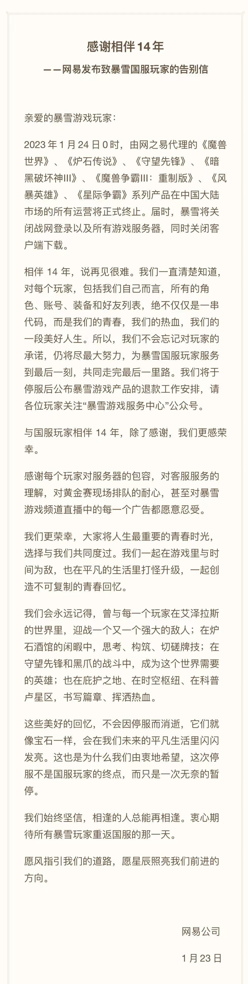 1月23日下午,网易发布了 《网易致暴雪国服玩家的告别信:感谢相伴14年》, 正式宣告了其代理的暴雪游戏国服进入停服倒计时。
