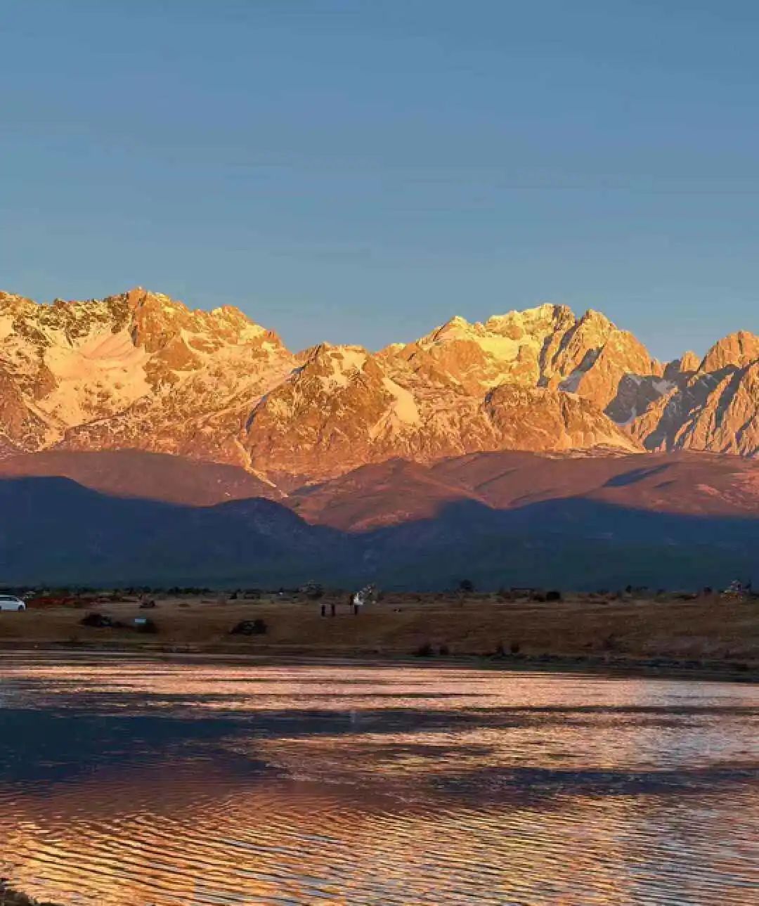 最幸运的是,我们看到了一年只有40天才有可能看见的日照金山,据说看见能幸运一整年。那天风特别大,大到索道都停了,只能在河对面等待日出。我们大概站了两个小时,眼见着金色的阳光一点点照亮群山、倒映在湖泊上。在海边长大的我,从没看到过这样的景观,真的很震撼。